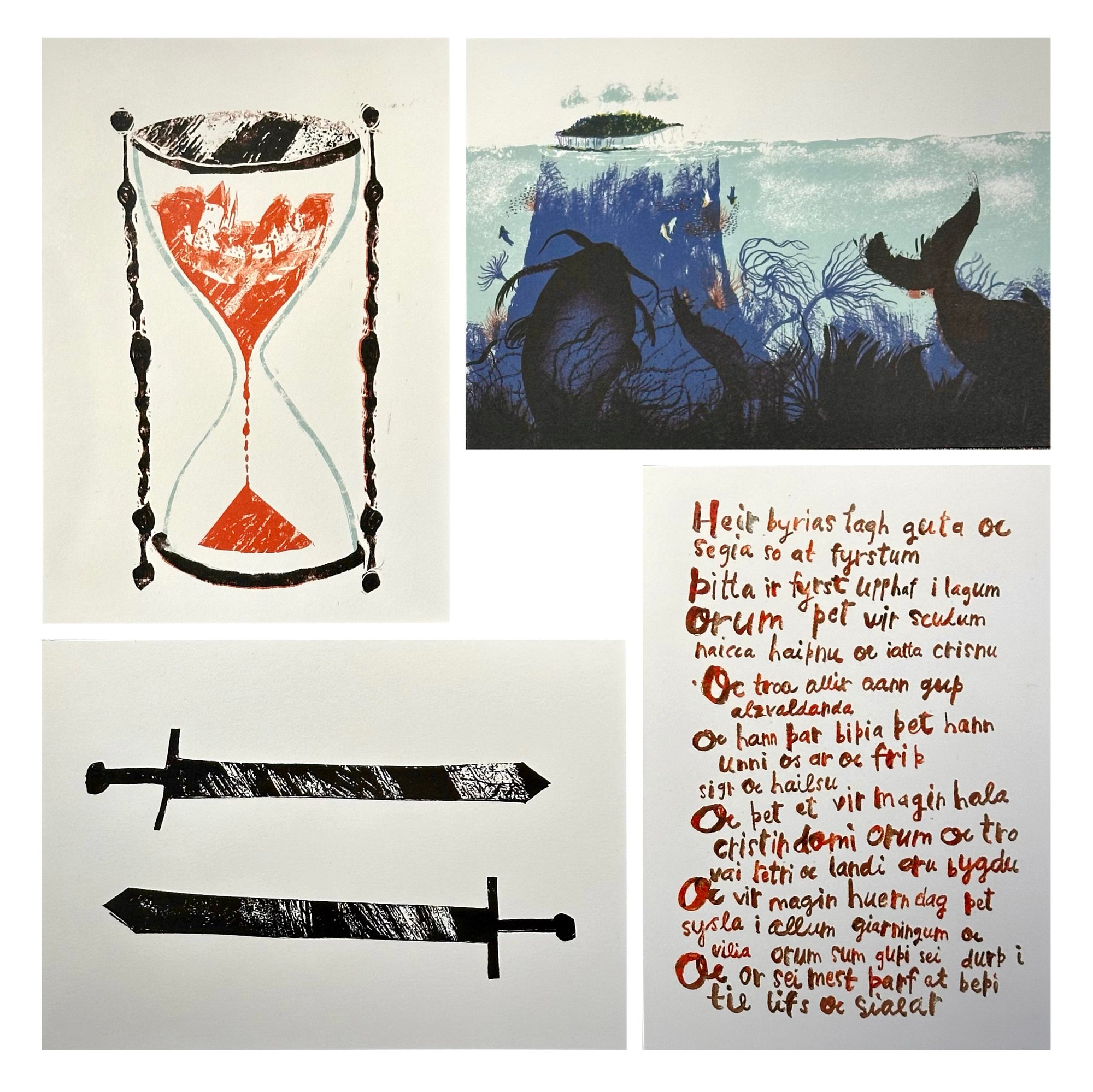 Fyra konstkort med illustrationer ur boken Ett delat land.